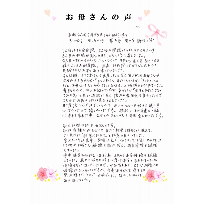 ☆H26年7月23日に出産されたママの声です☆ 2ページ分書いてくださりました。つづきあります。